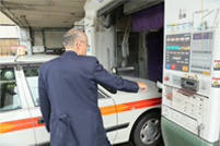 運行管理室で、終了点呼(アルコールチェック、売上入金、日報・運転者証の提出等)